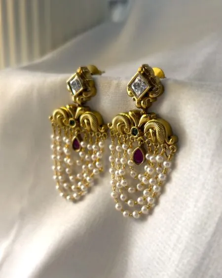 Step into tradition with grace and grandeur with our regal Chandanam Peacock Jhumkas, crafted to echo the opulence of South Indian heritage temple jewellery. Designed with majestic peacock motifs at the top and layered dome-shaped jhumkas below, this statement pair is an ode to royal temple artistry. The antique gold finish, intricate detailing, and strands of mini pearl beads add a luxurious touch, making it a perfect accessory for weddings, festive rituals, or heritage celebrations. Despite their bold presence, they remain lightweight and comfortable for long hours of wear. The graceful matte gold colour tone makes it a perfect jewellery to be paired with any colour of outfit making it a versatile piece.