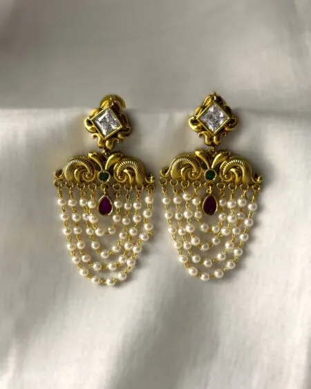 Step into tradition with grace and grandeur with our regal Chandanam Elephant Jhumkas, crafted to echo the opulence of South Indian heritage temple jewellery. Designed with majestic elephant motifs at the top and layered dome-shaped jhumkas below, this statement pair is an ode to royal temple artistry. The antique gold finish, intricate detailing, and strands of mini pearl beads add a luxurious touch, making it a perfect accessory for weddings, festive rituals, or heritage celebrations. Despite their bold presence, they remain lightweight and comfortable for long hours of wear.