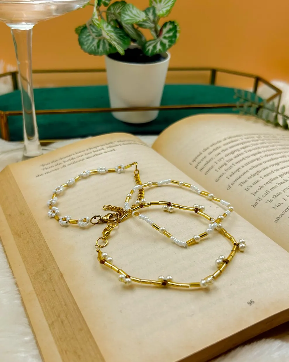Complementing the daisy bracelet are two stunning bead bracelets. The first features pretty pearls, symbolizing purity and elegance, while the second showcases white-gold crystal beads that radiate with brilliance and sophistication. Together, these bracelets create a mesmerizing symphony of colors and textures that captivate the senses.