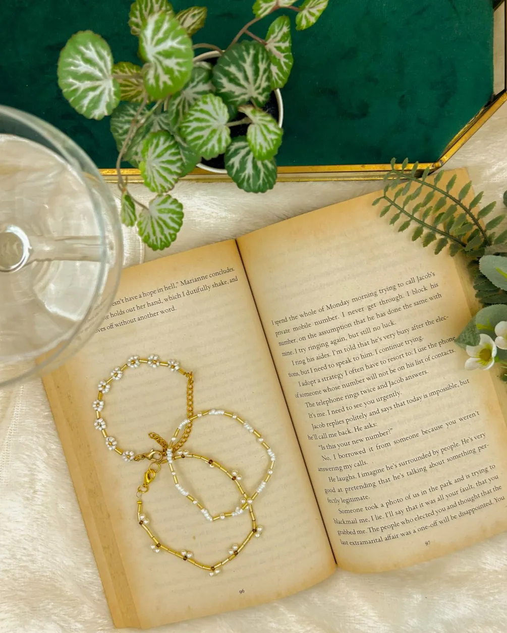 But that’s not all! The White Blossoms Bead Bracelet and Ring Stack also come with dainty golden rings and a white crystal ring. These rings add an extra touch of delicacy and beauty to the ensemble, mirroring the elegance and charm of the bracelets.