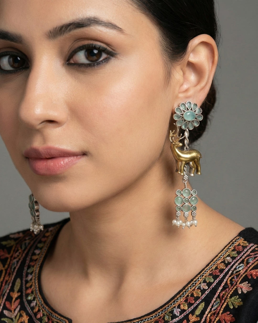 Crafted with the finest attention to detail, the Hirni earrings are a perfect blend of traditional design and modern elegance. The golden deer figurine is a symbol of grace and beauty, while the Jaipuri stone-studded flower motifs add a touch of color and vibrancy to the design. The design is a testament to the skilled craftsmanship that went into creating this exquisite piece of jewelry.