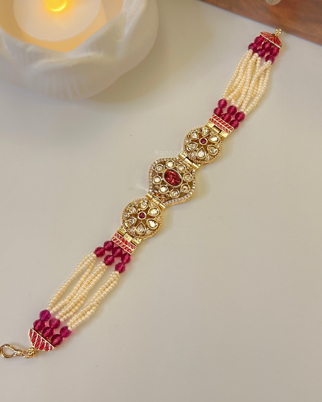 This exquisite bracelet features a vibrant magenta centre stone surrounded by delicate Polki-style detailing and sparkling American Diamonds. The clusters of rich magenta beads and multi-strand pearl tassels add a luxurious traditional charm. Perfect for festive occasions where you want your jewellery to speak sophistication. Wear it alone or pair it with a stack of kadas for a regal look.
