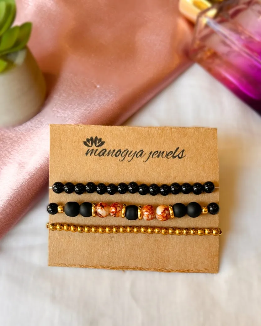 Stack on our Night is Young set of bracelets and keep slaying the party all night long! This chic stack features three bracelets with a killer combination of matte and glossy black beads paired with golden and brown textured beads.