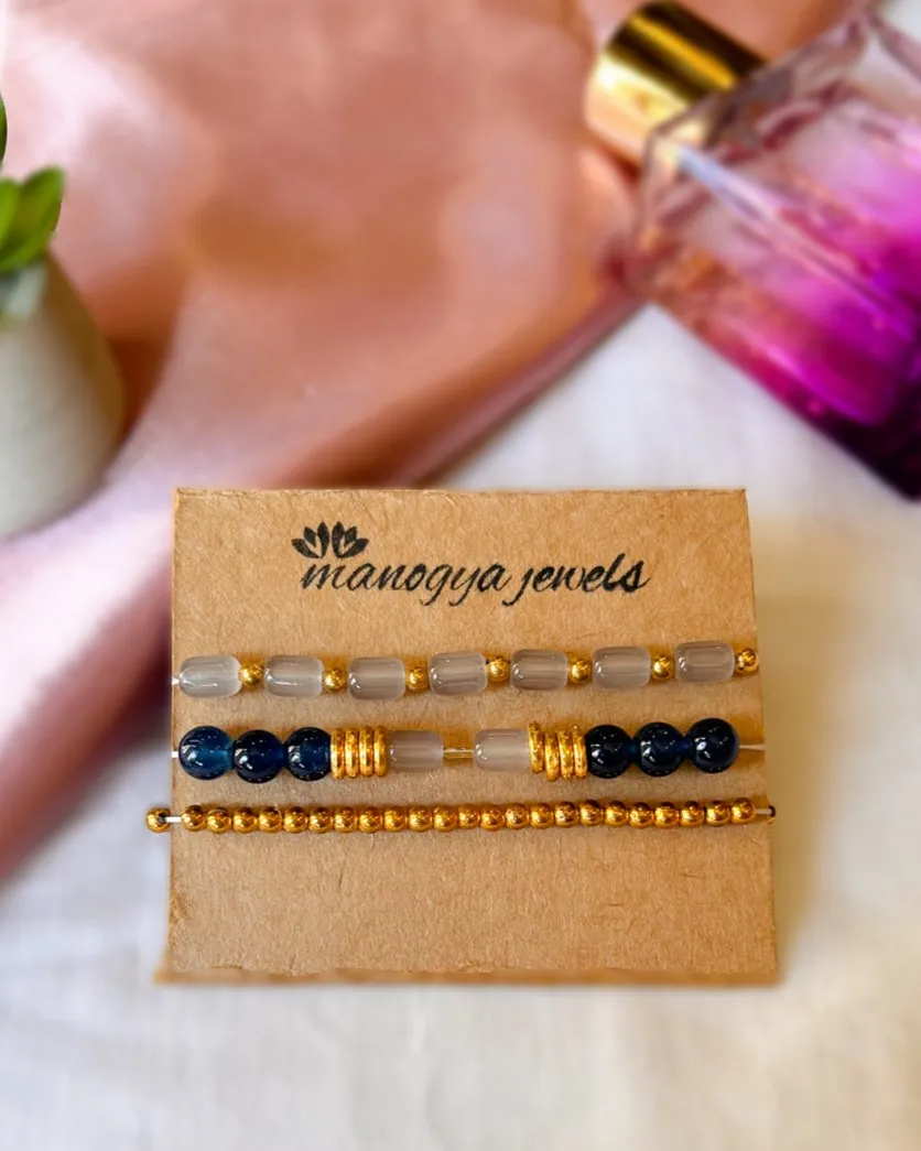 Elevate your wrist game with our handcrafted Royal Indulgence stack of bead bracelets, inspired by the chic aesthetics of Pinterest. This stack combines regal hues of royal blue, elegant grey, and luxurious gold beads, creating a stunning fusion of sophistication and style. Perfect for adding a touch of refined elegance to any ensemble, these bracelets are a must-have accessory for the modern trendsetter.