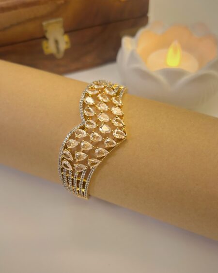 Shanaya is a stunning American diamond bracelet that features a modern, sculpted silhouette with intricately set pear-shaped stones arranged in a fluid, wave-like pattern. The combination of delicate gold-toned detailing and sparkling AD accents creates a refined, contemporary elegance that instantly elevates any look. Lightweight yet luxurious, it’s a statement piece that blends timeless charm with modern artistry.
