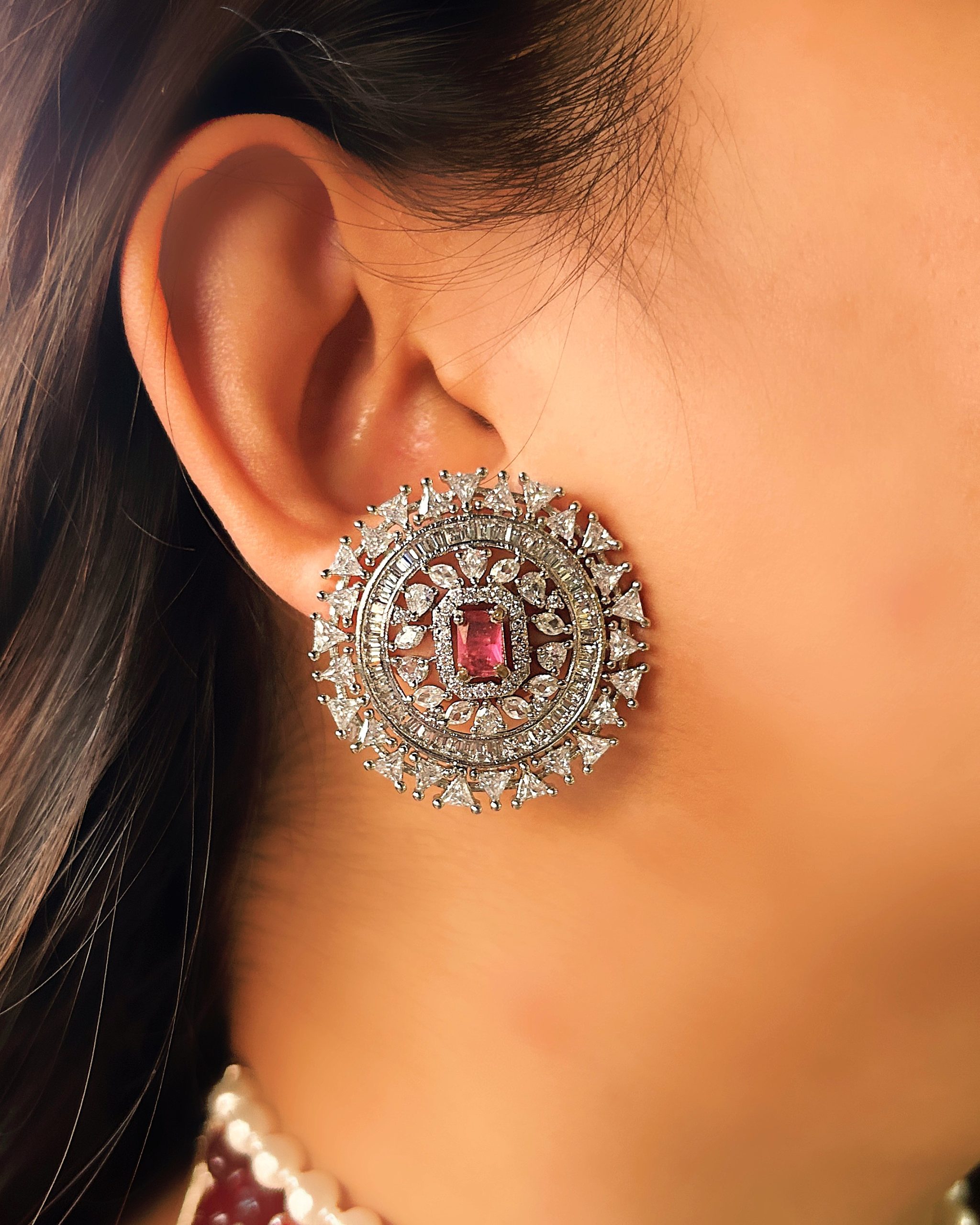 Often at crossroads whether to go all out and wear a dazzling heavy jewellery or go minimalist? Try our Kalpana necklace set that features an intricately designed oxidised pendant, studded with vibrant diamonds that encircle a maroon stone. This exquisite pendant sits atop a cluster of five crystal bead strings, all coming together to make an elegant choker necklace. The neckpiece is complimented by a pair of vibrant diamond studs.