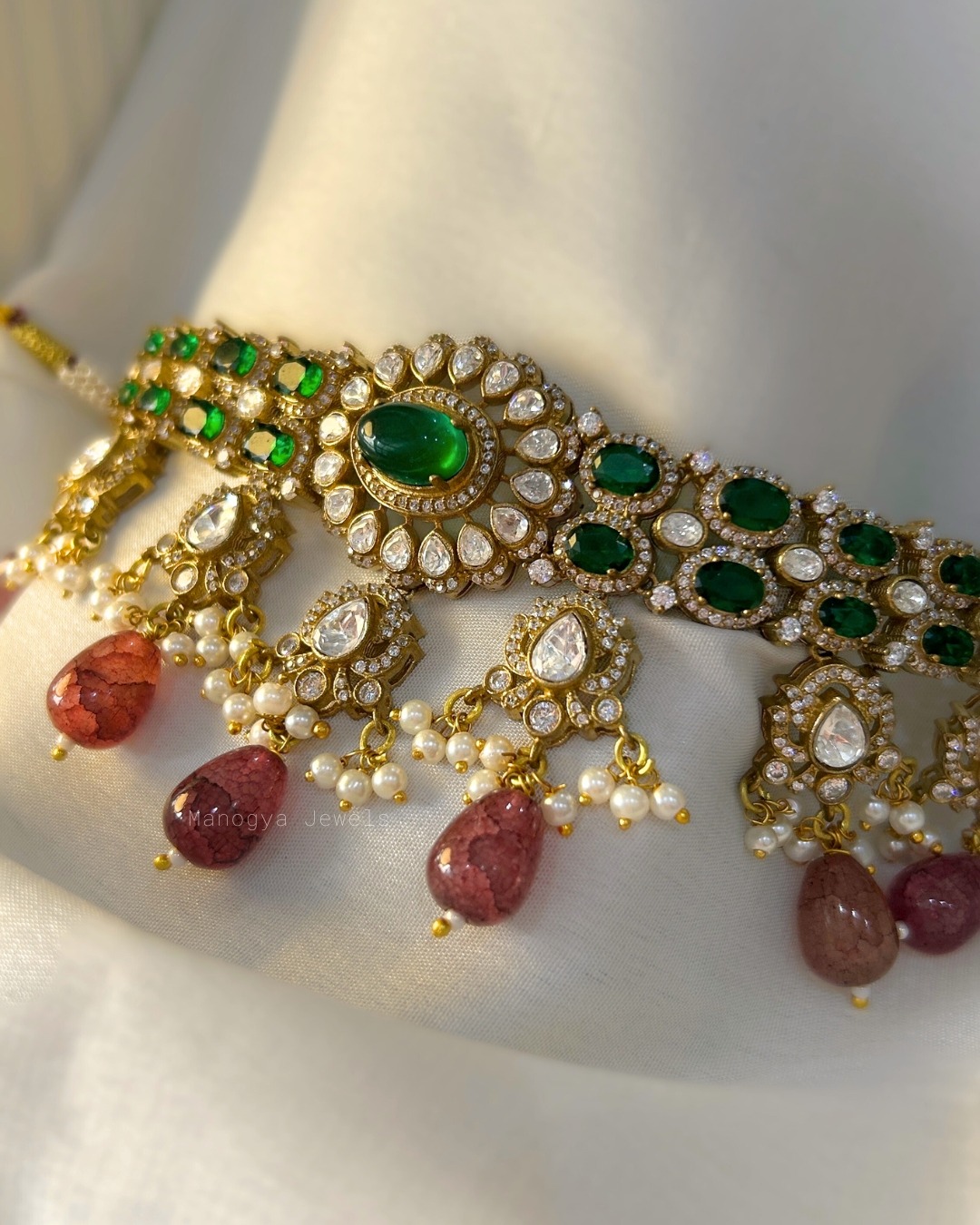 Pair this masterpiece with deep-toned silk sarees, velvet lehengas or bridal ensembles in emerald, ivory, or maroon. Keep your neckline open or off-shoulder to highlight the choker’s detailing, and style your hair in a sleek bun or soft waves for a polished, regal finish.