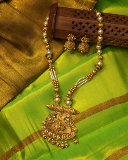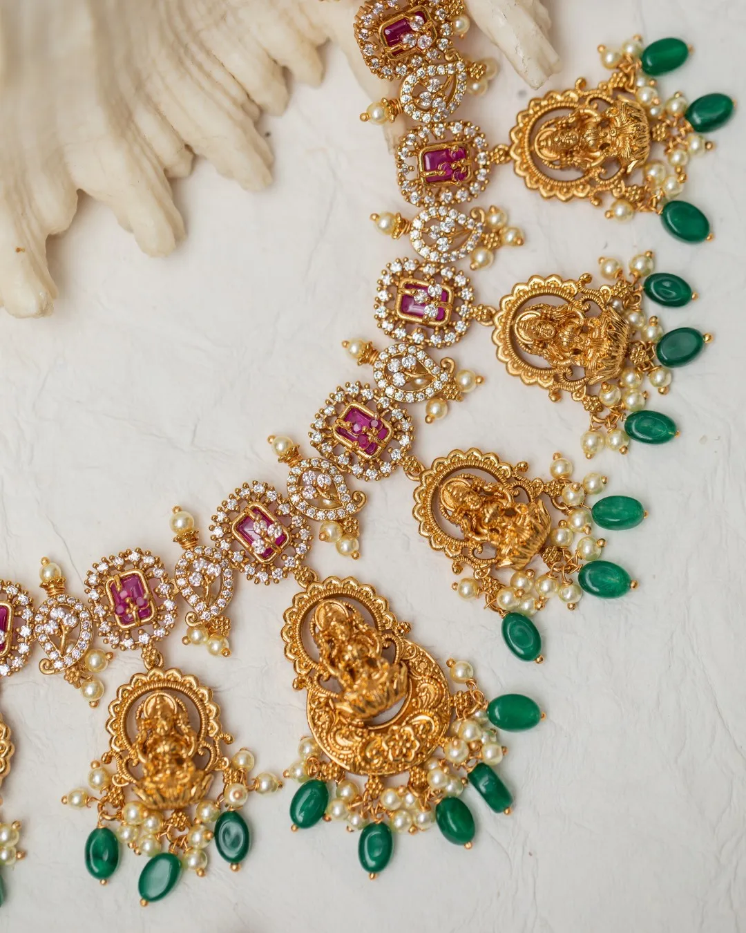Adorned with intricately carved Goddess Laxmi figurines, the necklace exudes an aura of celestial elegance and divine radiance, evoking a sense of spiritual grace and timeless allure that’s sure to leave you mesmerized. The figurines hang from a beautiful diamond and ruby stone-studded necklace, creating a captivating play of light and shadow that adds a touch of regal opulence and opulent charm to the ensemble.