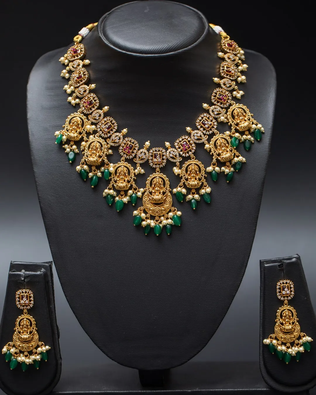 Enhancing the allure of the necklace are the emerald green stone droplets that harmoniously blend with the overall design, creating a sense of depth and dimension that’s sure to make you stand out and leave a lasting impression wherever you go. These droplets are more than just accents; they are a reflection of the intricate craftsmanship and exquisite design that elevates the necklace to the realm of art, making it a true testament to the rich cultural heritage and traditional charm that’s sure to captivate the hearts of all those who appreciate true beauty.