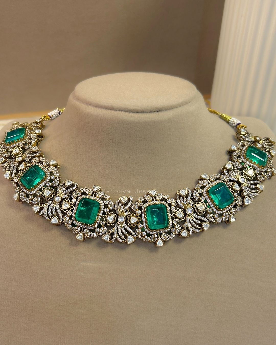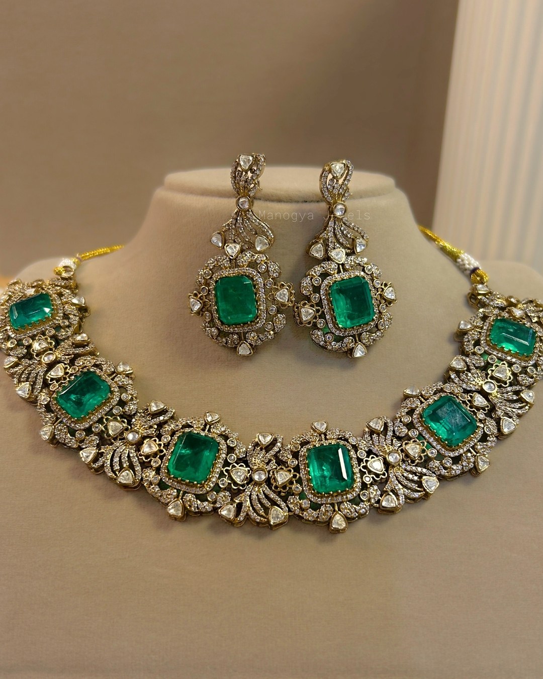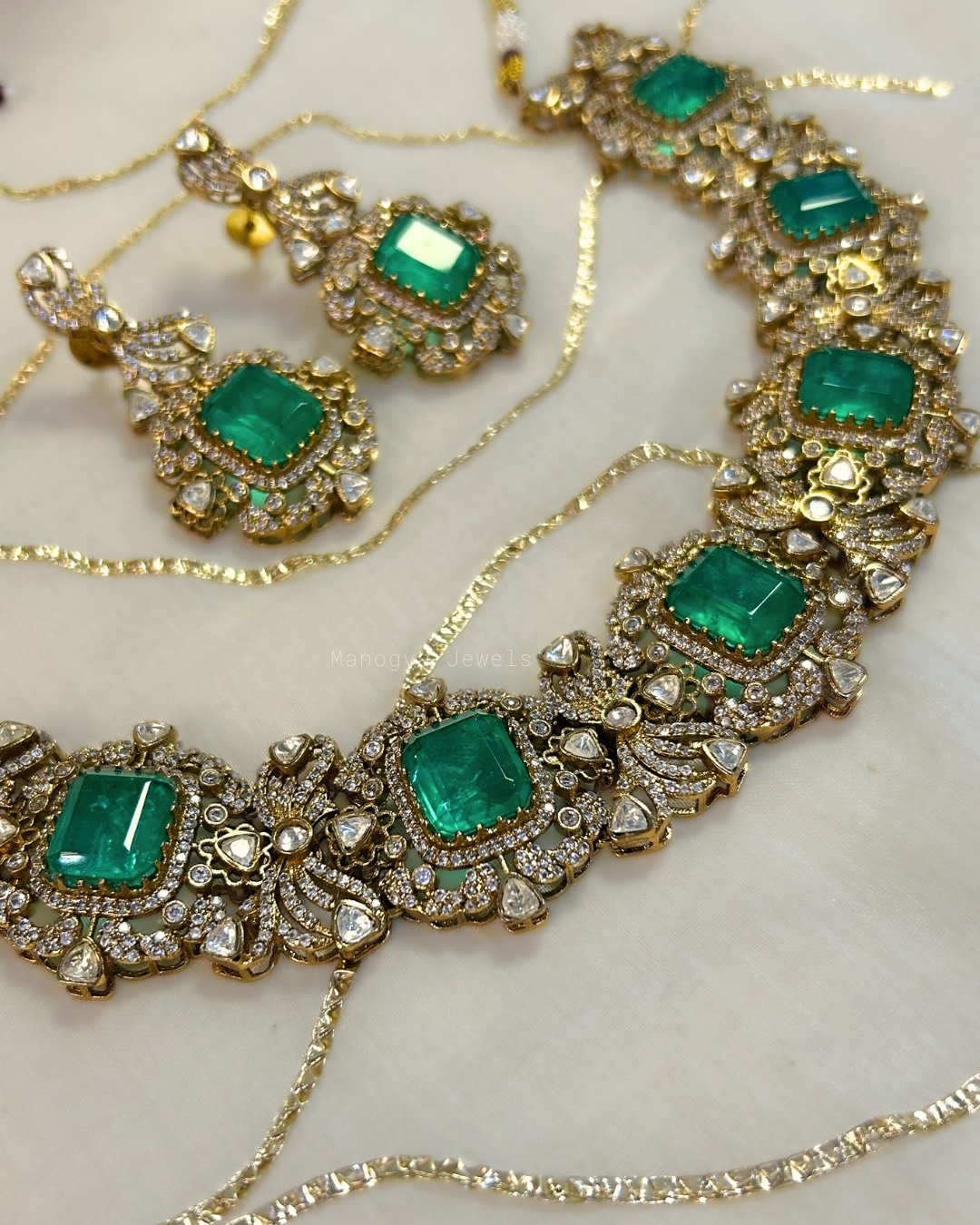 Styling Tip: Perfect for bridal or festive occasions, pair this set with an ivory, gold, or deep green lehenga for a majestic look. Opt for a classic low bun or center-parted waves to frame the necklace beautifully, and keep the makeup luminous with a hint of gold shimmer to enhance the emerald tones.
