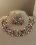 Often at crossroads whether to go all out and wear a dazzling heavy jewellery or go minimalist? Try our Kalpana necklace set that features an intricately designed oxidised pendant, studded with vibrant diamonds that encircle a maroon stone. This exquisite pendant sits atop a cluster of five crystal bead strings, all coming together to make an elegant choker necklace. The neckpiece is complimented by a pair of vibrant diamond studs.