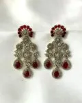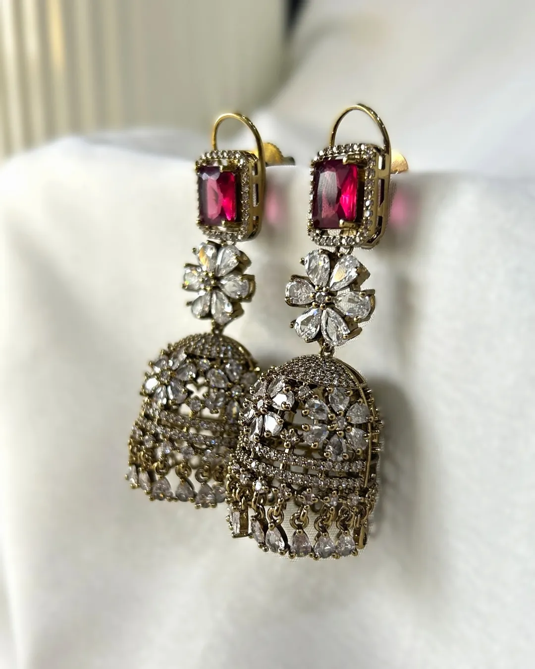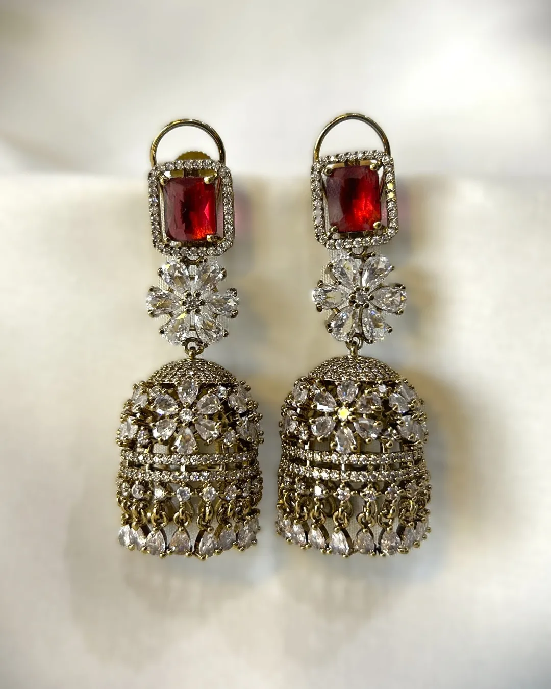 Turn every head in the room with these breathtaking Kavya jhumkas, handcrafted to perfection for the modern woman who loves timeless elegance. Featuring a striking square-cut ruby red stone framed in sparkling CZ diamonds, these earrings cascade into intricately studded floral jhumkas, adorned with shimmering American diamonds and finished in an antique gold polish. Perfect for weddings, festive occasions, and luxury celebrations, these statement jhumkas blend traditional charm with modern glam. The delicate dangle and detailed craftsmanship make them a must-have for bridal trousseaus and designer ethnic wear.