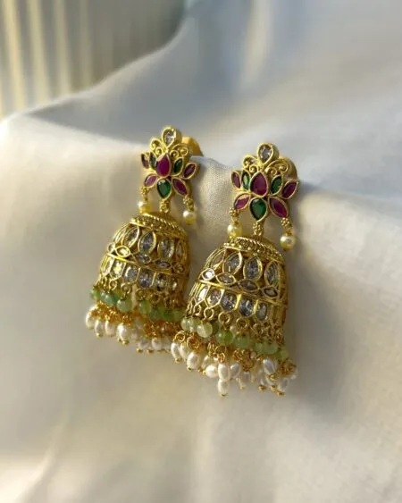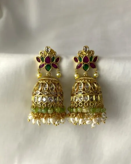 Add a burst of royal charm to your festive wardrobe with our Kritika Kundan Jhumkas. Crafted to perfection, these gold-toned earrings reflect traditional Indian jewellery aesthetics and feature intricate kundan work, a floral motif in rich ruby red and emerald green kemp stones. The jhumkas are adorned with a graceful fringe of green onyx beads and classic pearls. Whether you’re dressing for a wedding, haldi ceremony, or festive dinner, these earrings strike the perfect balance between opulence and wearability—ideal for fashion-forward women who value craftsmanship and affordability.