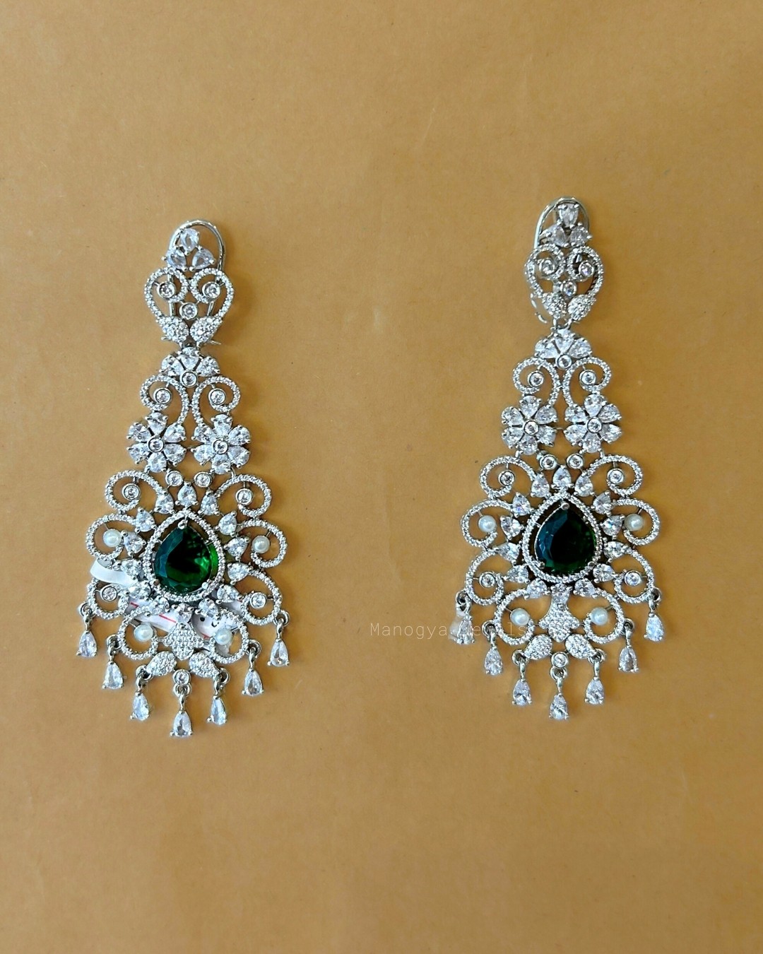 Our intricately crafted Manyata chandelier earrings feature a rich emerald-tone center stone framed by ornate silver and brilliant American diamond detailing, alongside tiny pearl accents. The cascading silhouette with delicate pearl and crystal drops adds graceful movement and regal charm. Designed to make a statement, they bring old-world elegance with a luxurious, bridal-ready appeal. Perfect for those who love jewellery that feels heirloom-worthy yet strikingly glamorous.