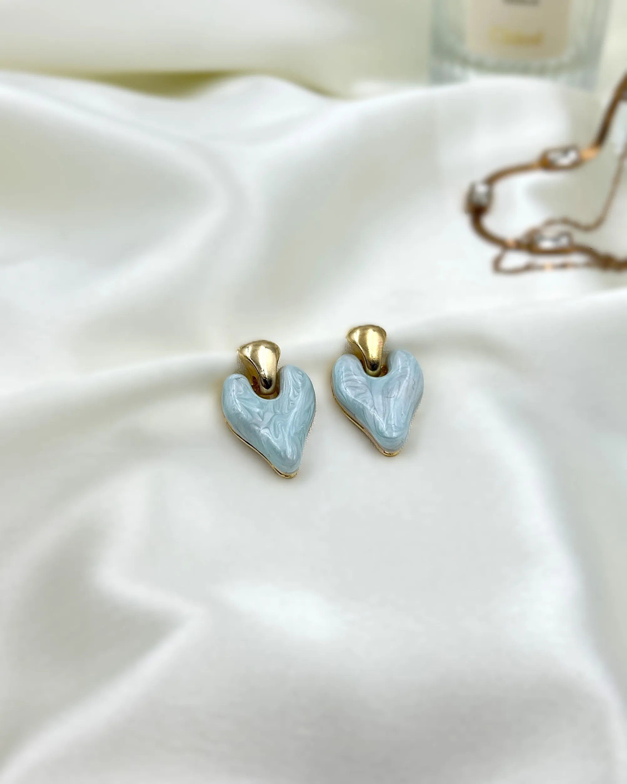 Our Amalfi earrings feature soft, blue innocent heart-shaped drops with a marbled finish, elegantly suspended from polished gold studs. Their unique design offers a delicate blend of modern charm and subtle sophistication, making them the perfect accessory for adding a touch of elegance to any outfit.