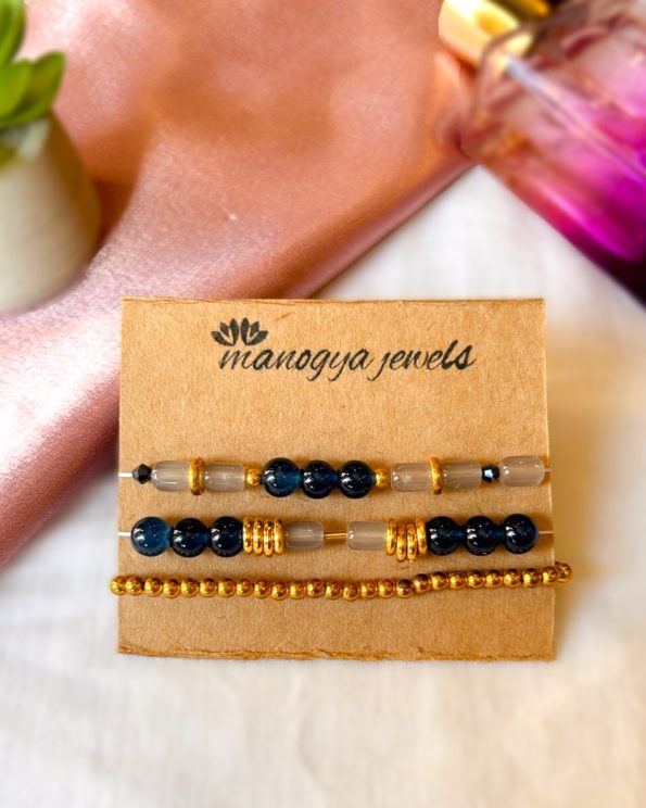 Let your style do all the talking with this Ocean Odyssey stack, featuring an alluring combination of navy blue and grey bead bracelets with gold accents.