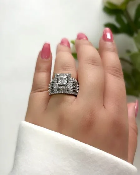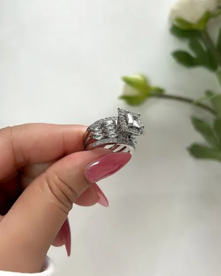 Sparkle without the splurge. Our Gloria Silver Statement Ring is a dazzling yet budget-friendly piece for fashion-forward women. Designed to mimic the elegance of fine diamond jewellery, this ring features a prominent square-cut solitaire at its center, accented with a shimmering halo and flanked by marquise-cut CZ stones on a bold triple-band setting. Crafted in a high-polish silver tone, the Gloria ring delivers maximum sparkle with minimum spend — perfect for parties, weddings, formal evenings, or simply elevating your everyday look. This budget-friendly stunner gives designer vibes without the designer price tag.
