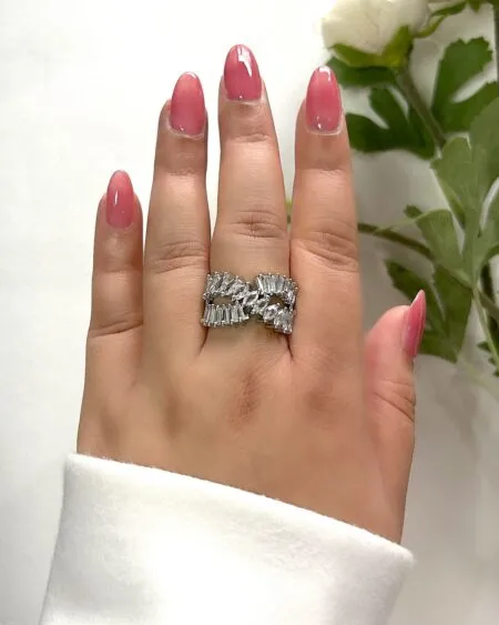 Elegant, Luxe and Budget-Friendly Glam – Yes, that’s what our Meloni Crystal Bow Statement Ring is here for. Make a bold yet graceful statement with our Meloni ring, a stunning accessory designed for the modern fashionista who loves affordable luxury. Featuring twin bow-shaped bands encrusted with high-shine baguette crystals, this ring brings a unique twist to everyday elegance. Crafted for style lovers who want to turn heads without breaking the bank, this piece delivers premium sparkle, lasting shine, and ultra-chic appeal in one lightweight, comfortable design. Perfect for both casual looks and evening edits, this ring is your new go-to glam essential.