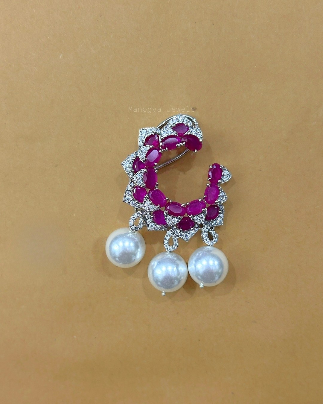 Our elegant Akira crescent-shaped earrings feature a striking play of deep magenta stones, brilliant CZ sparkle, and soft pearl drops. The contrast of rich color and luminous pearls creates a look that feels regal yet refined. Designed to catch the light with graceful movement, they bring instant sophistication to festive and evening ensembles. A statement pair that feels luxurious without being overwhelming.