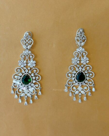 Our intricately crafted Manyata chandelier earrings feature a rich emerald-tone center stone framed by ornate silver and brilliant American diamond detailing, alongside tiny pearl accents. The cascading silhouette with delicate pearl and crystal drops adds graceful movement and regal charm. Designed to make a statement, they bring old-world elegance with a luxurious, bridal-ready appeal. Perfect for those who love jewellery that feels heirloom-worthy yet strikingly glamorous.
