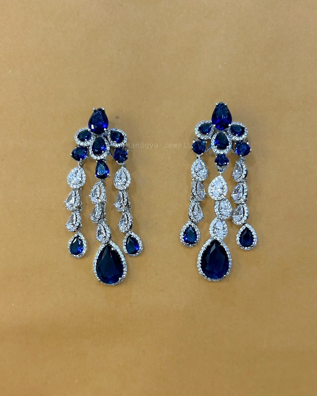 These breathtaking Benazeer chandelier earrings feature deep sapphire-blue stones framed by brilliant CZ detailing, cascading into an elegant, fluid silhouette. Each tier catches the light beautifully, creating a rich play of sparkle and color that feels unmistakably luxurious. Designed to make an impact, they evoke fine-jewellery grandeur while remaining effortlessly wearable. A true statement piece for evenings that call for drama and sophistication.