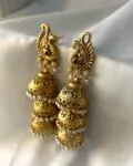 Step into tradition with grace and grandeur with our regal Chandanam Elephant Jhumkas, crafted to echo the opulence of South Indian heritage temple jewellery. Designed with majestic elephant motifs at the top and layered dome-shaped jhumkas below, this statement pair is an ode to royal temple artistry. The antique gold finish, intricate detailing, and strands of mini pearl beads add a luxurious touch, making it a perfect accessory for weddings, festive rituals, or heritage celebrations. Despite their bold presence, they remain lightweight and comfortable for long hours of wear.