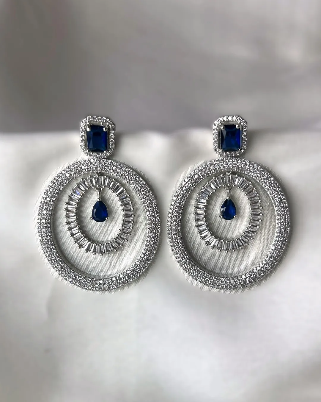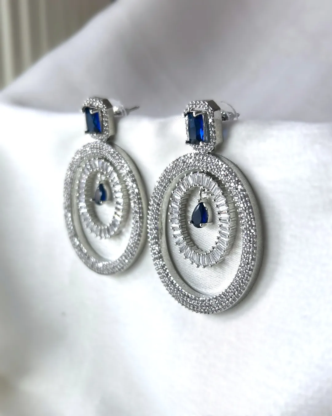 Our Dinisha Halo AD Earrings are an amalgamation of modern minimalism and artistic grandeur. These earrings are a stunning ode to refined luxury. Designed for the woman who appreciates bold statements in subtle forms, each earring features concentric oval halos paved with precision-set CZ diamonds and baguette-cut brilliance, centred with a suspended royal blue pear-cut stone that adds a captivating pop of color. The sleek geometry and fluid silhouette of this design reflect the spirit of the modern zeitgeist – bold, elegant, and endlessly versatile. Set in luminous white rhodium finish, these earrings seamlessly transition from art gallery soirees to elevated evening wear.