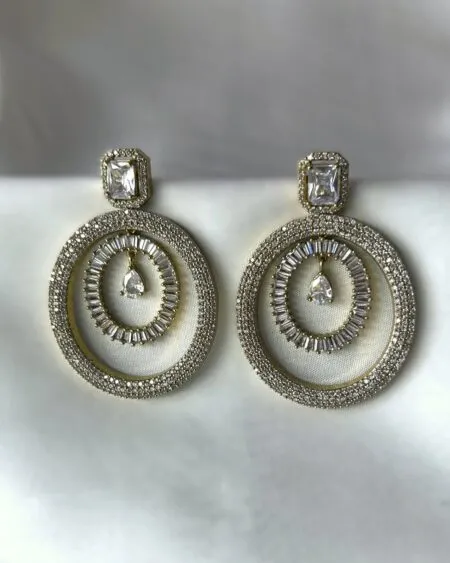 Add a touch of timeless glamour to your look with our Ursula Sparkling Teardrop AD Earrings. Designed for the fashion-forward woman who seeks high style on a budget, these dazzling earrings feature brilliant-cut white stones in a layered floral and teardrop design. Perfect for weddings, parties, or everyday elegance, they bring luxury vibes without the luxury price tag. Crafted to mimic the brilliance of fine diamond jewellery, these earrings are lightweight, skin-friendly, and suitable for all-day wear. Whether you’re styling a sari, cocktail dress, or formal suit, Ursula earrings are the budget-friendly statement piece that elevates your look instantly. They also make for an ideal gift for Bridesmaids and fashion lovers.