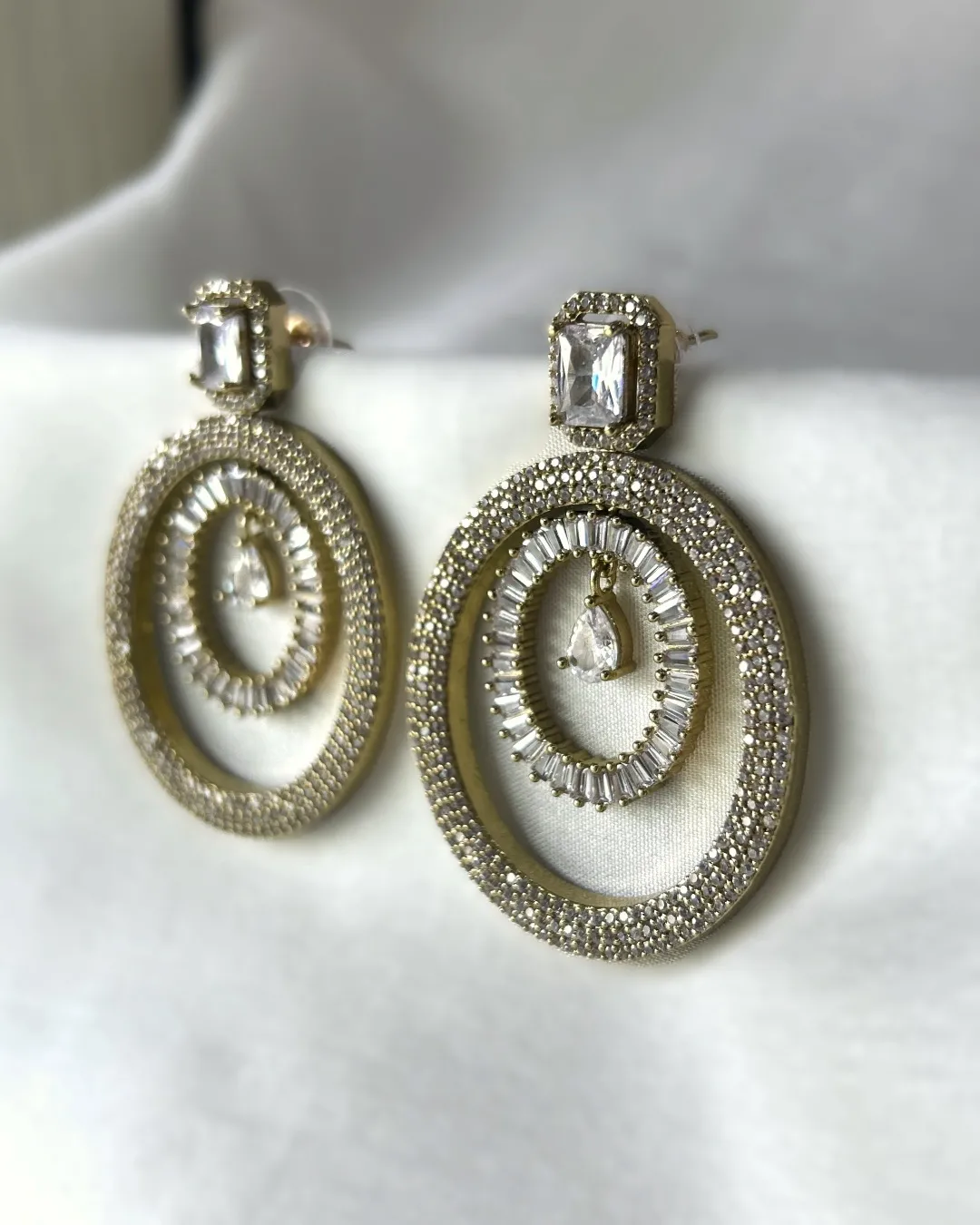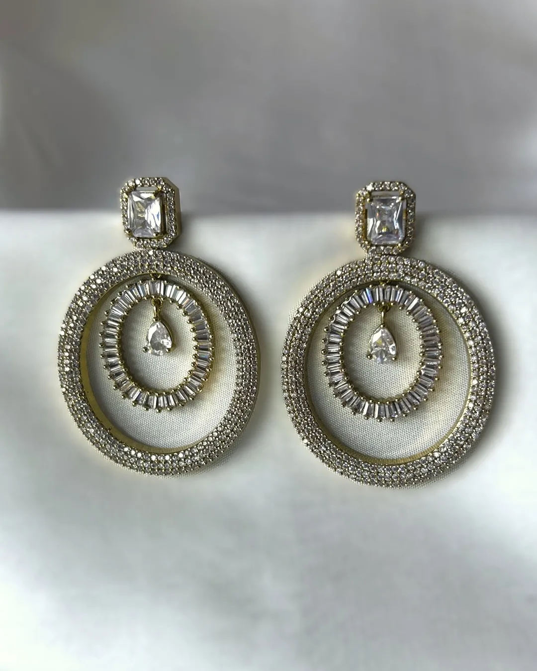 For the woman who invests in meaningful jewellery that speaks in silences, our Orion Prism Earrings, an exquisite blend of heritage grandeur and modern minimalism. These designer earrings feature a regal teardrop CZ solitaire set within a crown of precision-cut stones, transitioning into a bold, geometric square crystal suspended like a prism of light. Framed in delicate micro pavé and finished in antique gold, the symmetrical interplay of pear and princess cuts reflects meticulous craftsmanship and architectural finesse. Whether you’re curating a couture look or dressing for a gala, these earrings command attention with understated opulence. Perfect for red carpet events, luxury weddings, or intimate soirées, the Orion Prism Earrings celebrate the art of adornment with elegance that transcends trends.