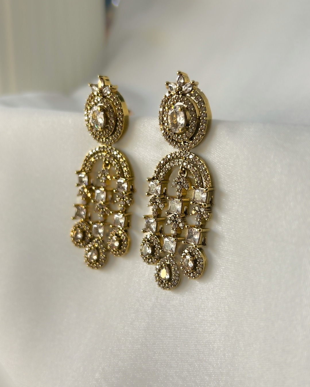 For the woman who invests in meaningful jewellery that speaks in silences, our Orion Prism Earrings, an exquisite blend of heritage grandeur and modern minimalism. These designer earrings feature a regal teardrop CZ solitaire set within a crown of precision-cut stones, transitioning into a bold, geometric square crystal suspended like a prism of light. Framed in delicate micro pavé and finished in antique gold, the symmetrical interplay of pear and princess cuts reflects meticulous craftsmanship and architectural finesse. Whether you’re curating a couture look or dressing for a gala, these earrings command attention with understated opulence. Perfect for red carpet events, luxury weddings, or intimate soirées, the Orion Prism Earrings celebrate the art of adornment with elegance that transcends trends.