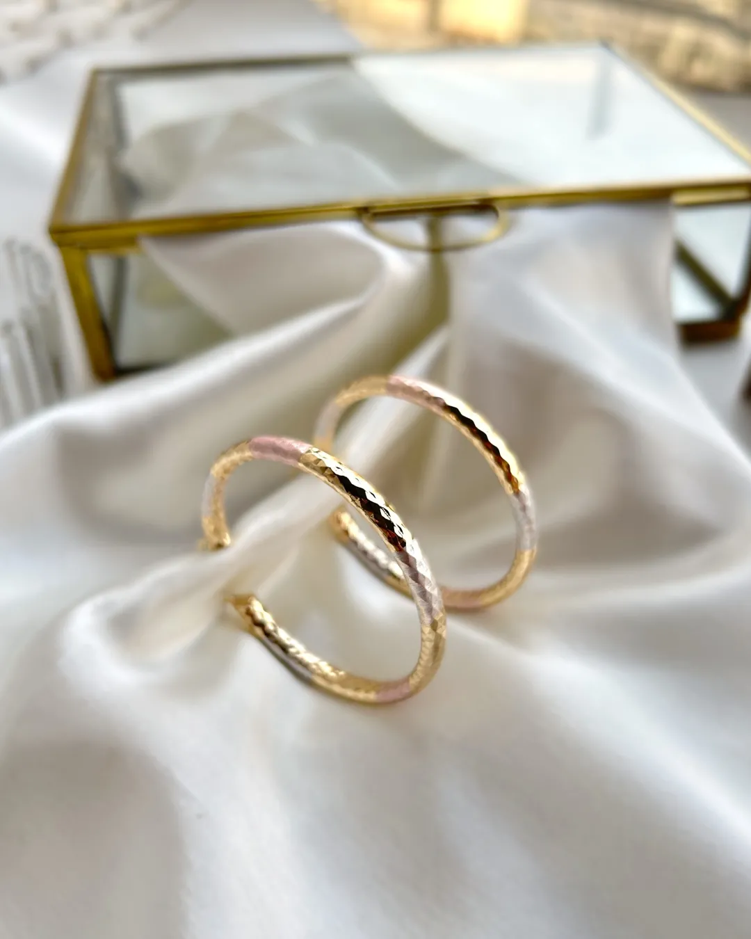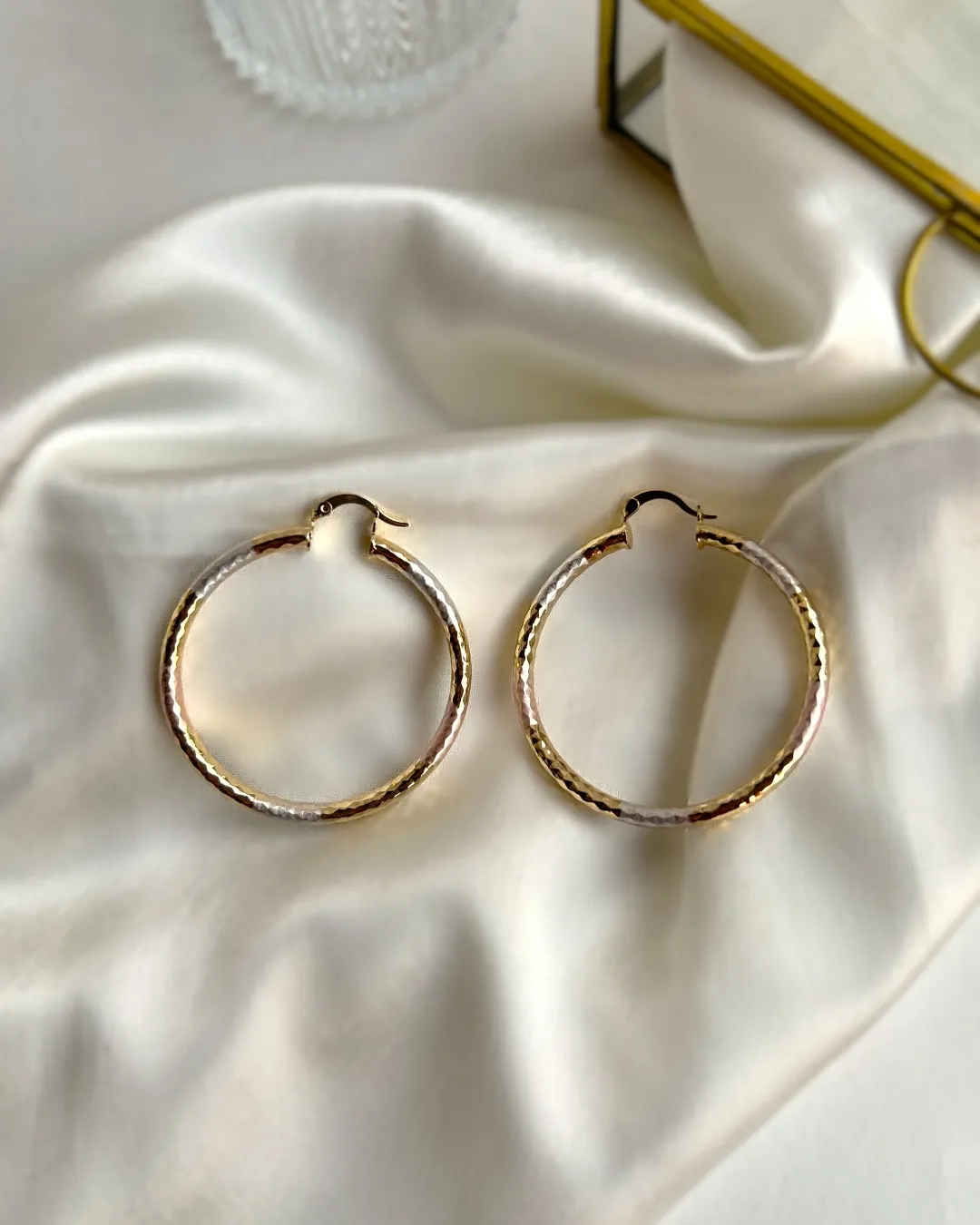Textured Elegance in Every Turn, that’s Katy Mixed Metal Hoops for you! Featuring a chic hammered texture and a subtle blend of rose gold, silver, and classic gold polish, these lightweight statement earrings are the perfect balance of modern flair and timeless shine. Crafted in anti-tarnish stainless steel, they’re hypoallergenic, durable, and designed for effortless all-day wear. From casual brunches to date-night glam, these hoops bring a soft shimmer that compliments every skin tone and outfit.