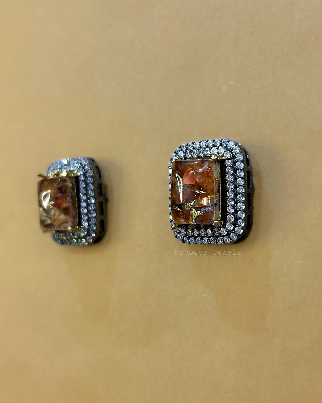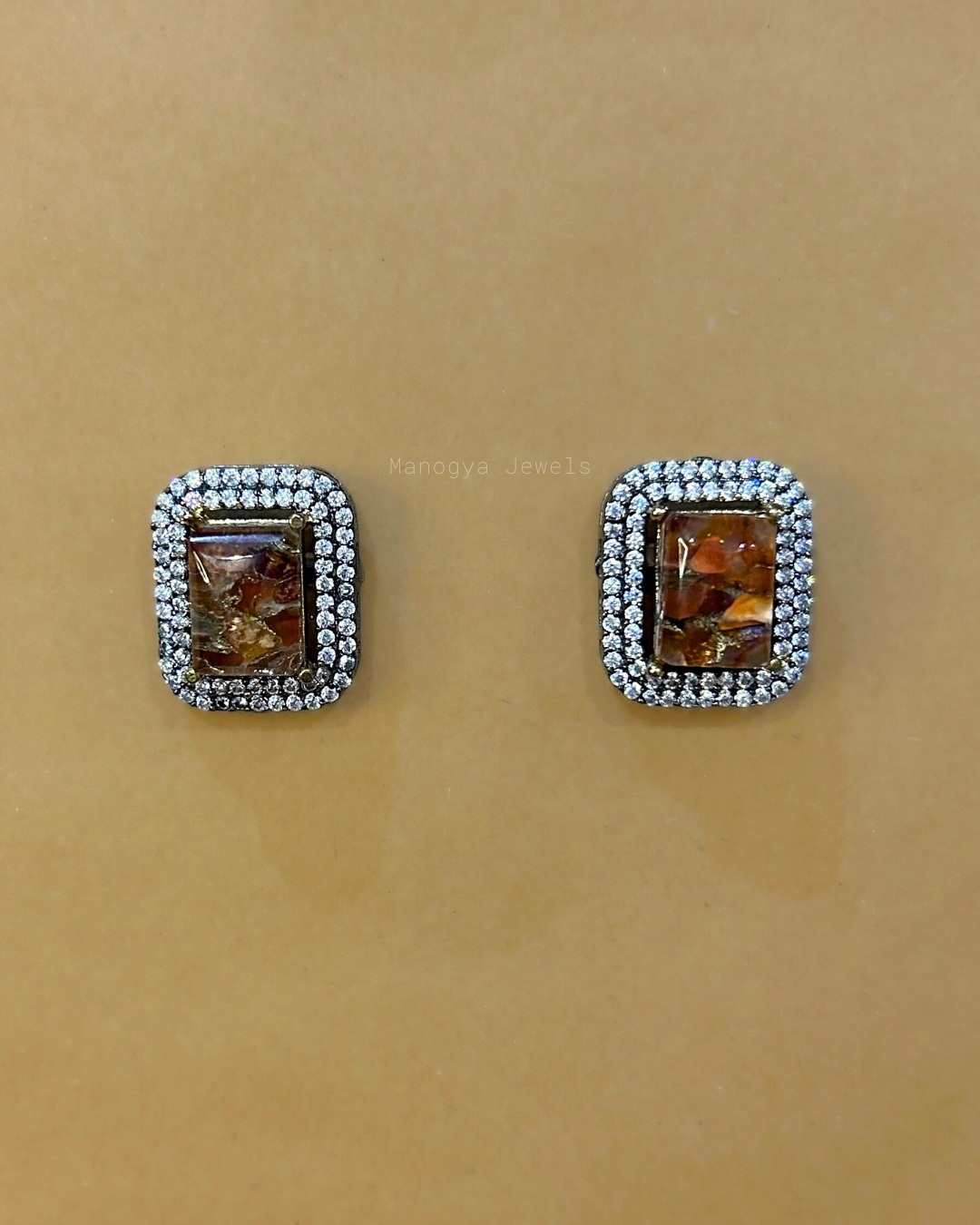 Our Nafisa studs with gold brown marble effect exude earthy charm blended with high-end sparkle. The warm-toned center stone paired with a double halo of shimmering CZ crystals makes them the perfect balance of subtle and standout. Designed for everyday glamour, these earrings transition seamlessly from workwear to evening ensembles.