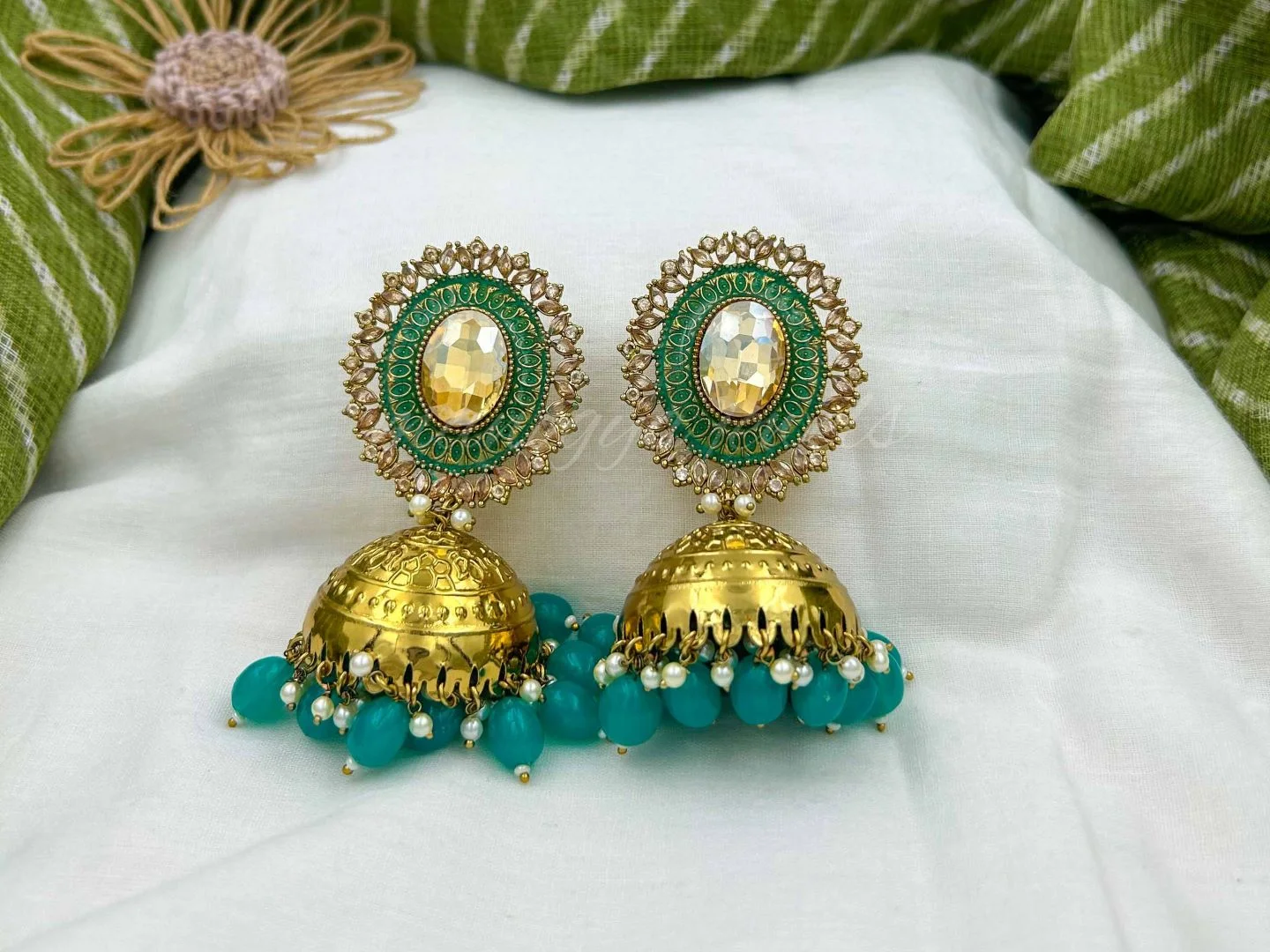 Our Jiva jhumkis boast the fabulous combination of Victorian-polished base, vibrant diamonds and grey droplets, which helps you attain a minimal look best for occasions when you wanna carry an Indian attire but not go overboard!