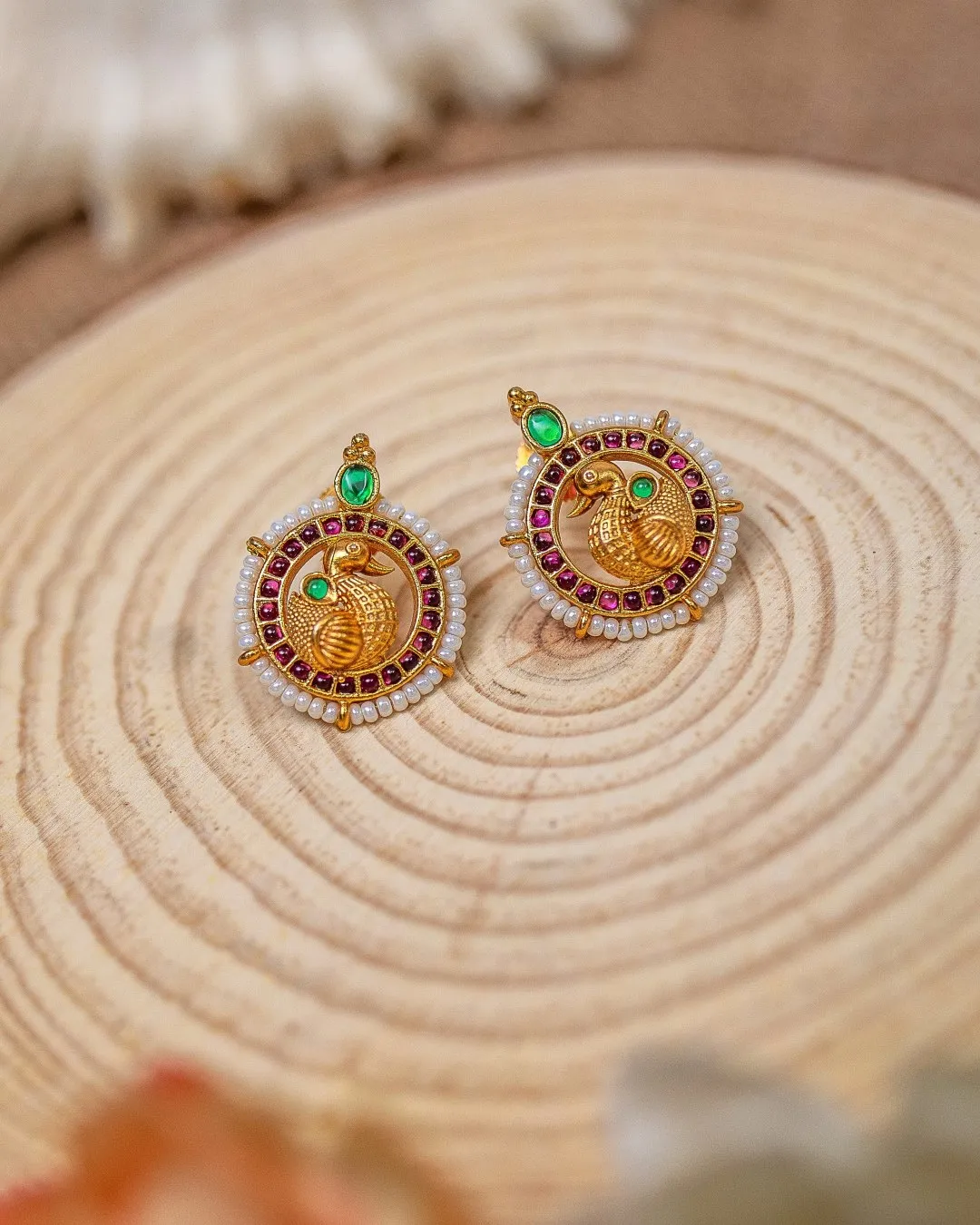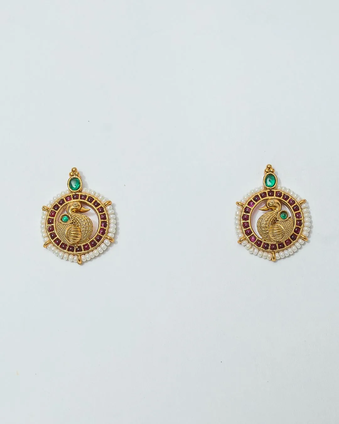 Our pretty little Palki stud earrings feature a beautifully carved swan motif at the center, surrounded by vibrant magenta kemp stones. Topped with a striking green stone, these gold-toned circular studs are encircled by a delicate line of pearls. Perfect as a minimal accessory, these earrings elegantly complement traditional Indian attires, adding a touch of timeless charm and cultural heritage.