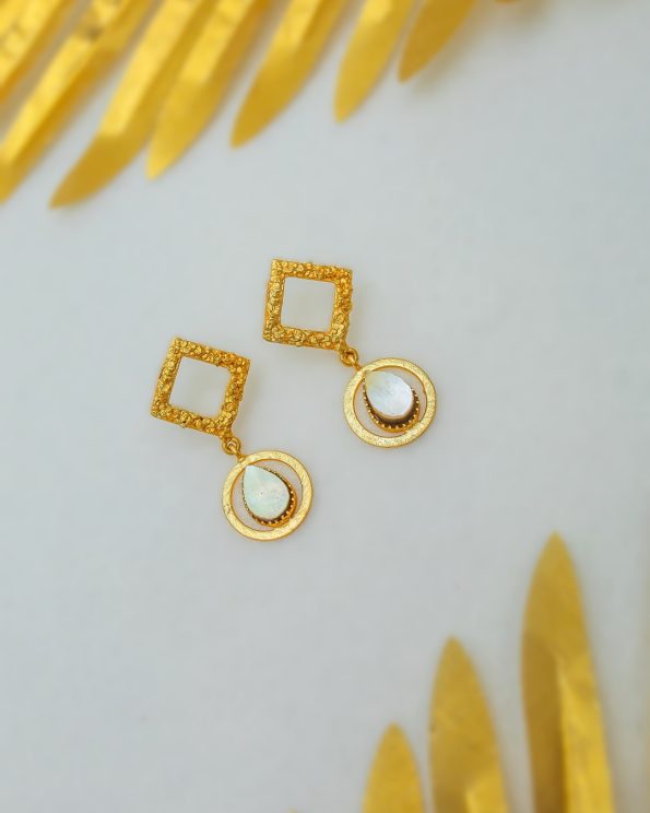 Elevate your look with our Saira golden-hued earrings, exuding understated elegance. Featuring a textured square stud design, these earrings offer a touch of sophistication to any ensemble. Suspended delicately from each stud is a lustrous mother of pearl droplet, adding a subtle hint of shimmer and refinement. Perfect for both casual and formal occasions, these earrings are a versatile addition to your jewelry collection.