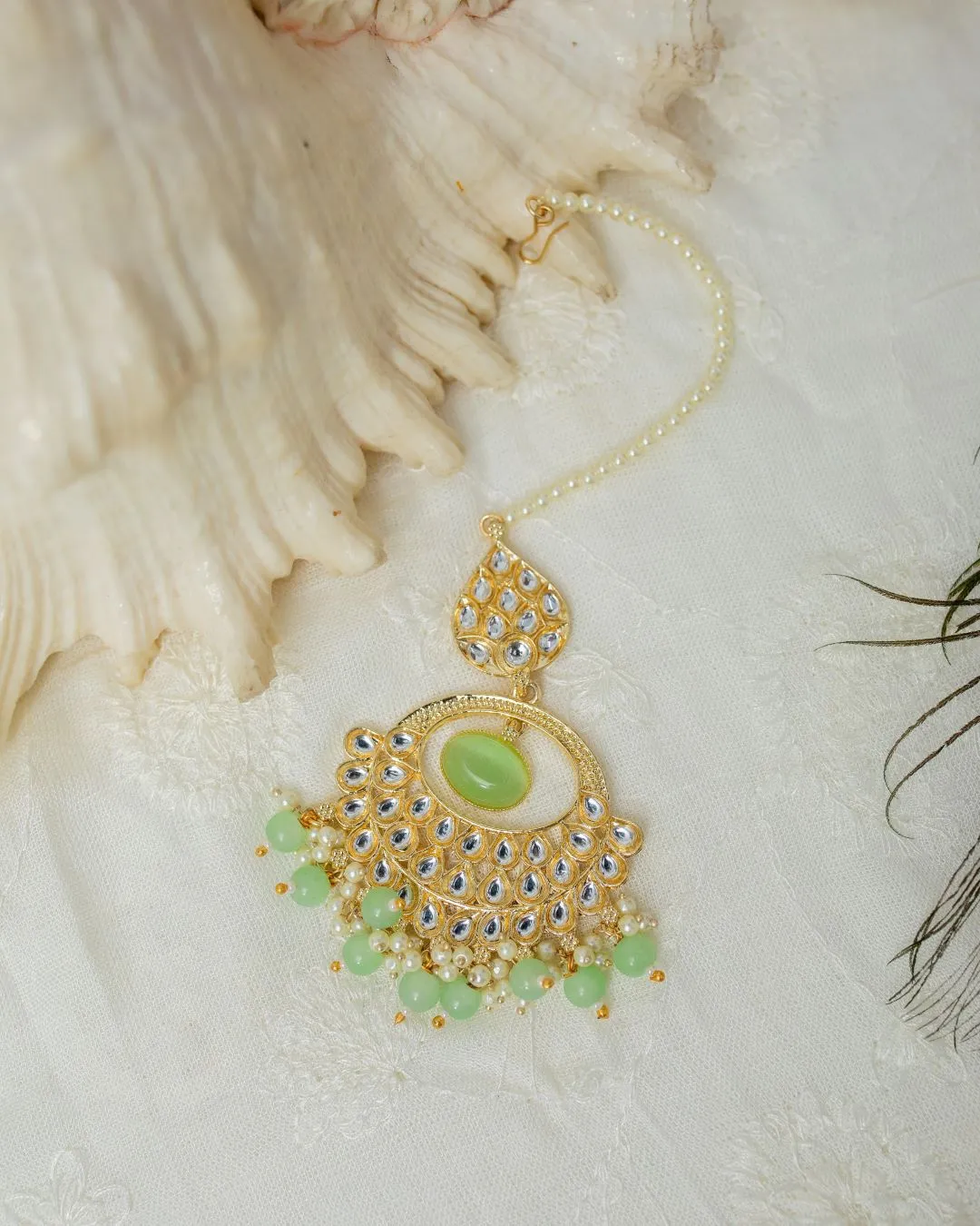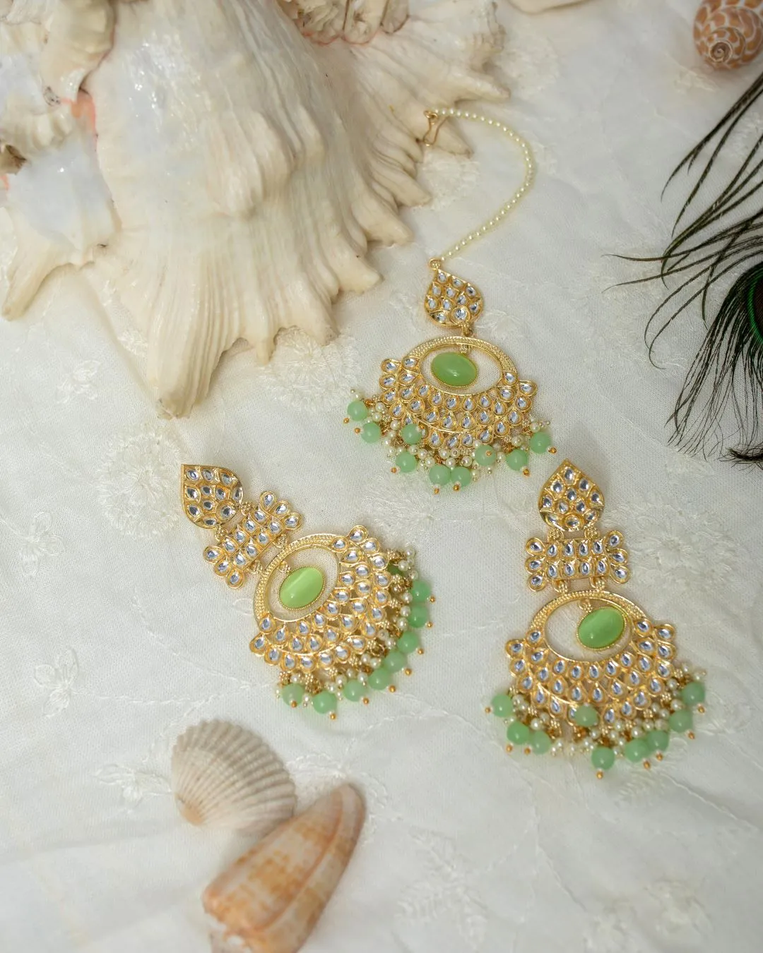 These beautiful long earrings are set with kundan and feature a gorgeous mint green monalisa stone in the center, while tiny pearl and mint green bead droplets complete the look. They come with matching maang tika.