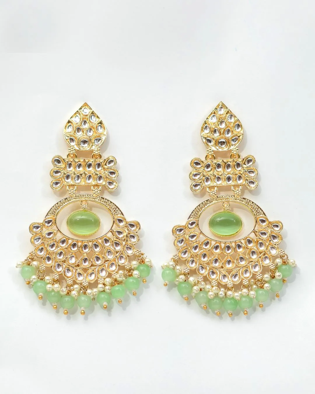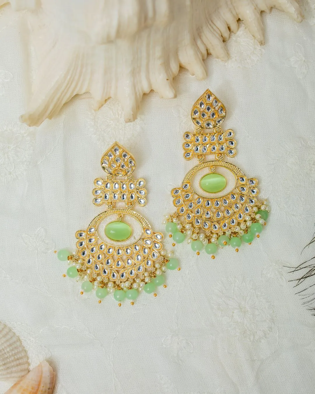 Our lovely Pankti earrings are embellished with kundan and accentuated with pearl and pista green glass beads. They are lightweight and can instantly glam up any outfit.
