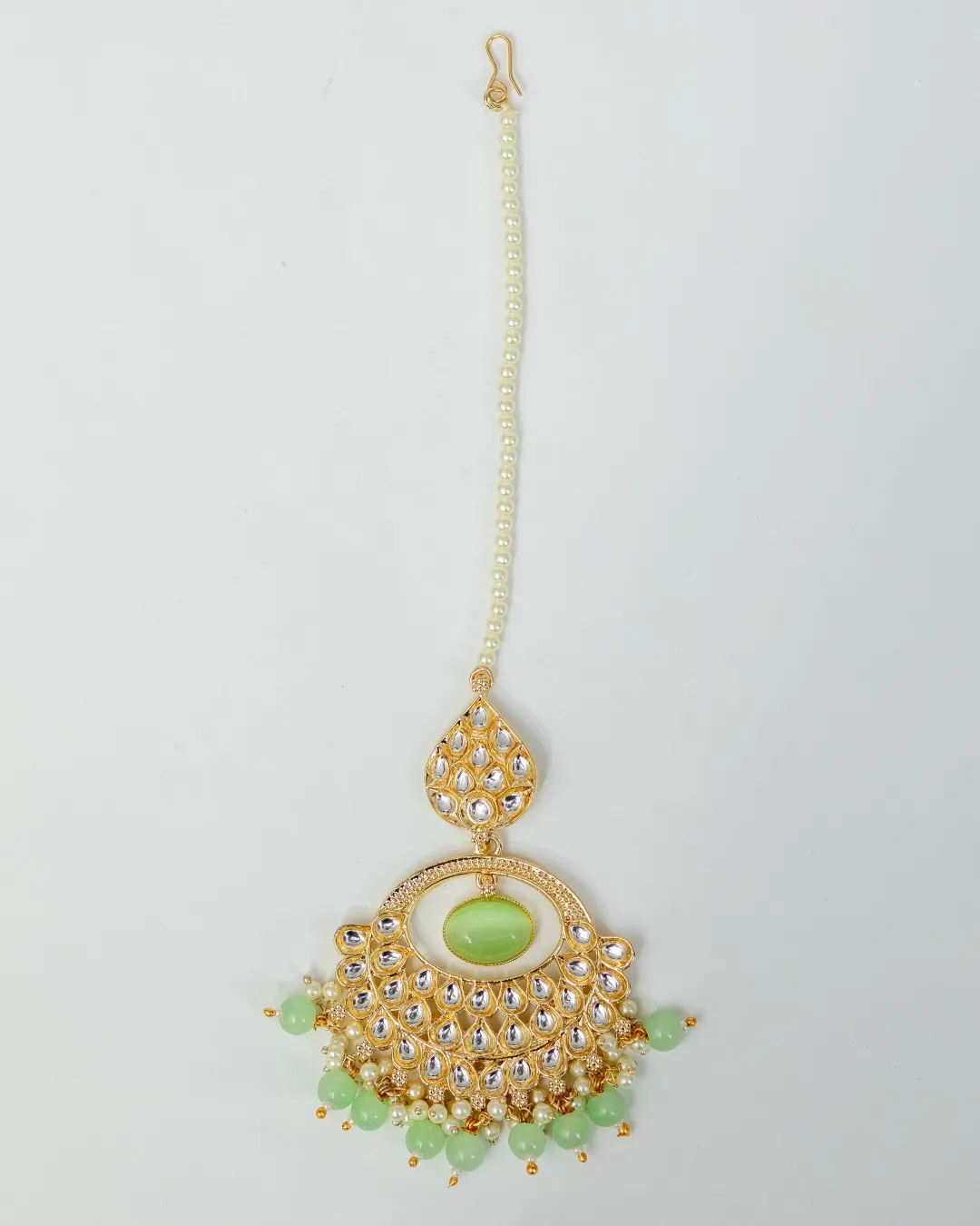 In addition, our Shaima combo set includes a matching maang tika, making it the ultimate accessory for any traditional Indian outfit. The maang tika is intricately designed with the same kundan stones and mint green monalisa stone, creating a cohesive and stunning look that will surely turn heads.