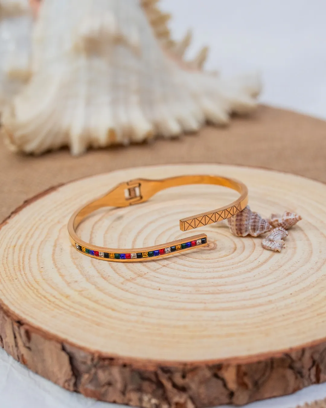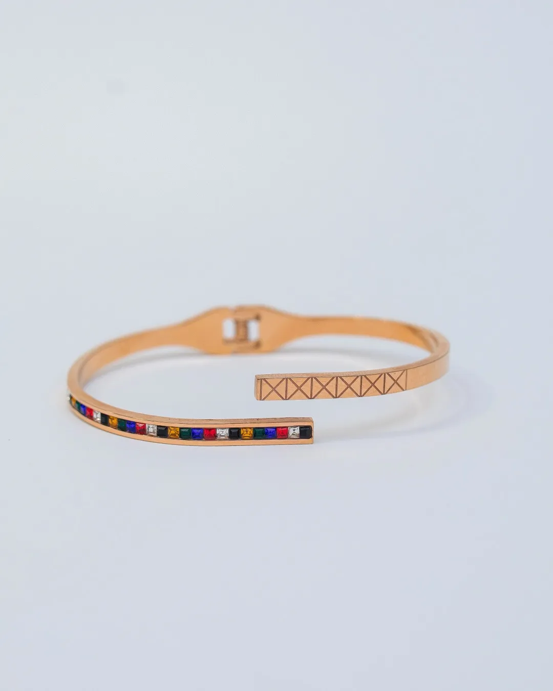 Our Alice bracelet looks like it’s straight from Alice’s wonderland. At one end of this enchanted bracelet, a treasure trove of vibrant, lively stones awaits. It’s a riot of colors, a kaleidoscope of hues that would make even the Mad Hatter jealous! On the other end, a mesmerizing display of engraved abstract patterns.