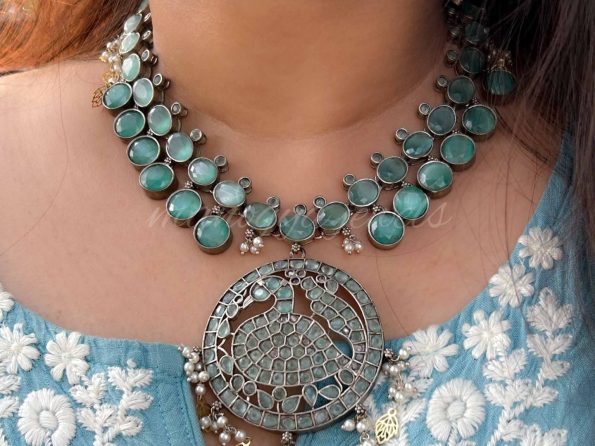 Anisha Stone Necklace with Peacock Motif – Mint Blue