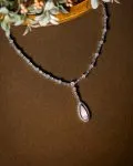 Often at crossroads whether to go all out and wear a dazzling heavy jewellery or go minimalist? Try our Kalpana necklace set that features an intricately designed oxidised pendant, studded with vibrant diamonds that encircle a peach stone. This exquisite pendant sits atop a cluster of five crystal bead strings, all coming together to make an elegant choker necklace. The neckpiece is complimented by a pair of vibrant diamond studs.