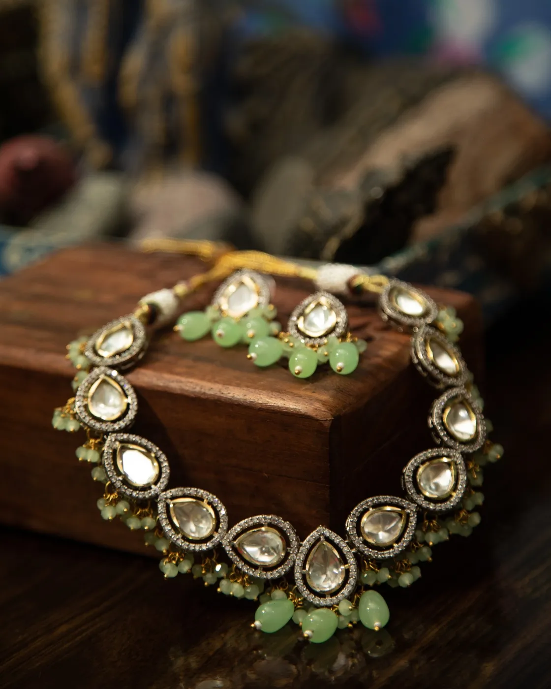 Crafted with the finest materials, Inayat features a single line of exquisite polki with stunning sea green-colored hydrobeads and crystal beads that add a pop of color to its minimalist design. This necklace exudes an air of refined beauty, making it the perfect accessory for any occasion.