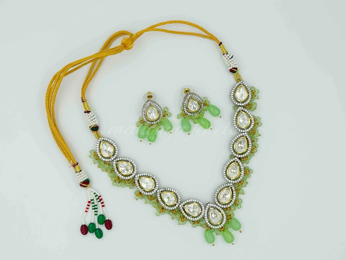 A simple and sleek polki necklace meant for those who prioritise elegance but definitely not at the cost of style. Inayat is a simple single line polki necklace with seagreen-coloured hydrobeads and crystal beads that add a splash of colour to this otherwise minimal style. The necklace is paired with complimenting minimal polki kundan earrings that mimic the necklace’s styling.