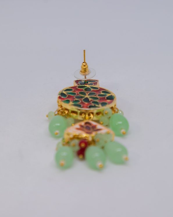 Crafted to make you look gorgeous, this necklace features a round pendant studded with kundan and comes with strings featuring seagreen hydro beads and crystals with hints of red – courtesy of red crystal beads. The backside of the pendant features intricate meenakari design.
