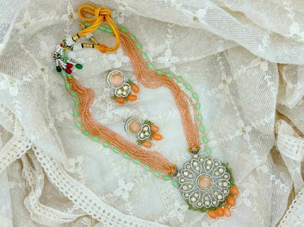 Our Nima necklace boasts an intricately carved floral pendant which is embellished with pachi kundans, peach hydro stone and tiny cubic zirconias. Green crystal and peach glass bead droplets further beautify the pendant. The pendant is held together by long peach-coloured crystal strings with contrasting sea green hydro bead strings. The necklace is accompanied by a pair of matching earrings.