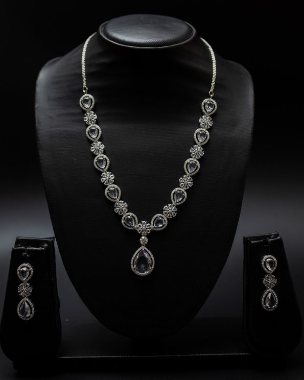Introducing our Priyaasi necklace, a masterpiece of artistic jewelry design. Crafted with alternating diamond-studded flowers and pear-shaped diamond motifs along the string, this stunning necklace sparkles with clear and dazzling American diamonds. Made with a rhodium-plated base, it exudes a timeless elegance. A stunning pear-shaped diamond droplet at the center completes the look with elegance and sophistication. Complete with a pair of complementary diamond earrings featuring floral motifs and pear-shaped motifs, the Priyaasi necklace set is the epitome of grace and glamour.
