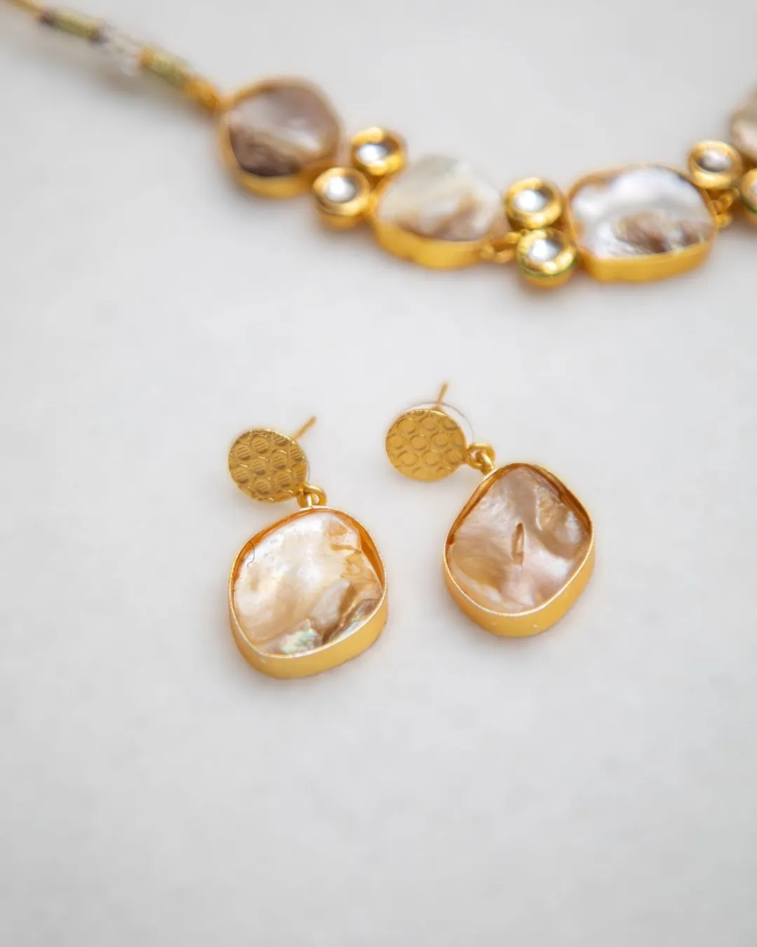 Elevate your style with our pretty Delnaz mother of pearl necklace, seamlessly blending traditional design with modern minimalism. Adorned with a captivating mother of pearl pendant encircled by a cluster of delicate pearls, this necklace exudes timeless elegance. Held together by a dainty gold hasli-style wire, the pendant is complemented by matching mother of pearl studs, mirroring its enchanting design. Embrace sophistication and grace with this exquisite jewelry set, perfect for adding a touch of refined allure to any ensemble.