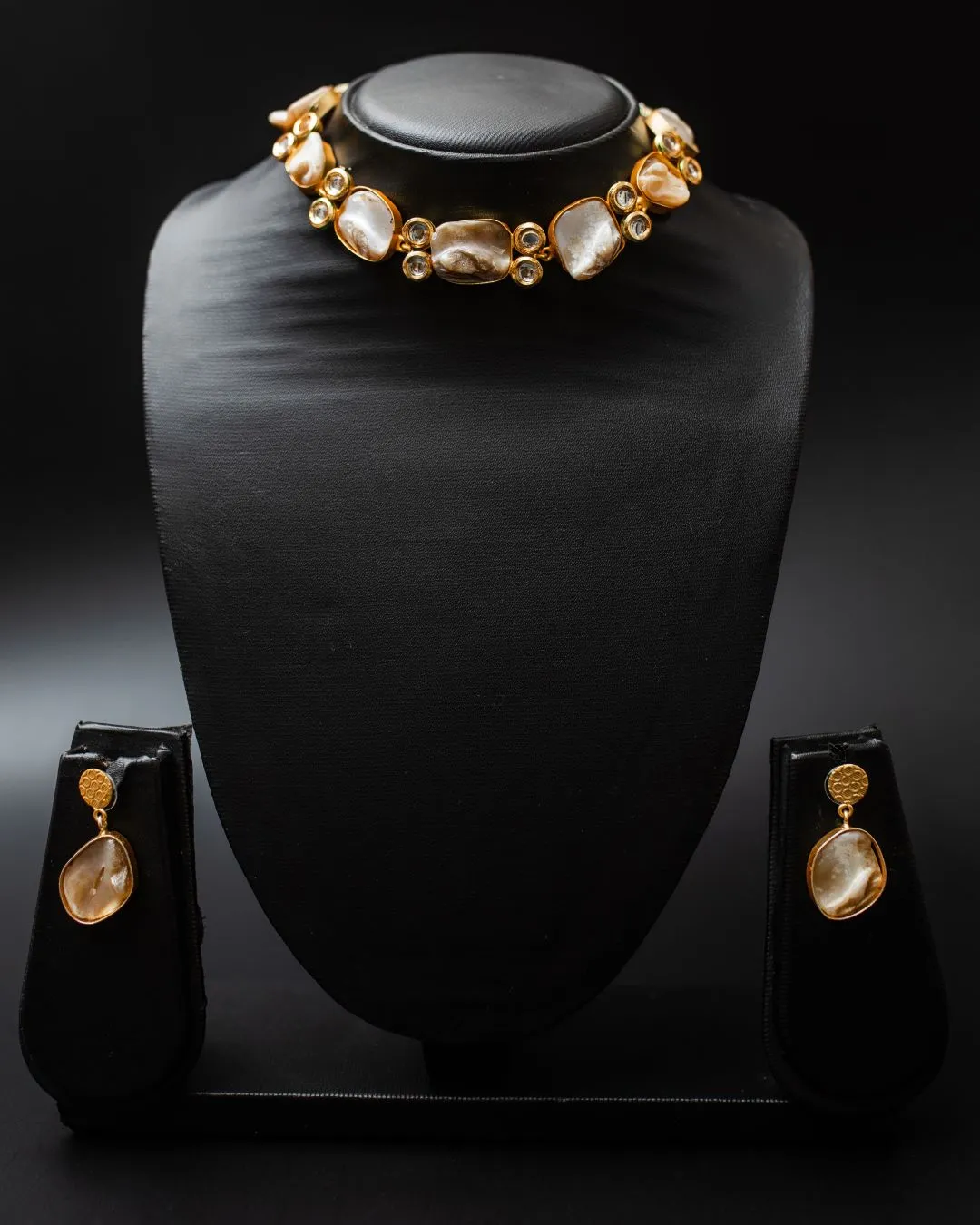 Introducing our Ramona necklace, a captivating fusion of elegant mother of pearl and majestic kundan stones meticulously arranged in a choker necklace design. Versatile and timeless, this piece effortlessly complements both traditional Indian attire and Western ensembles, making a bold statement wherever you go. Complete with matching mother of pearl earrings, the Ramona set adds a touch of refined sophistication to any look.