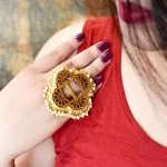 Karishma ring is really a marvellous piece of jewellery which holds tightly onto the traditional Indian charm with its timeless amalgamation of kemp stones, kundans and pearls. The circular silhouette of the ring features a kundan-studded flower in the centre, surrounded by beautiful magenta kemp stones. Tiny pearls outline the ring, creating an elegant and charming ring that is fit for any festive occasion. The ring truly gives royal vibes and can certainly amp up your entire look.