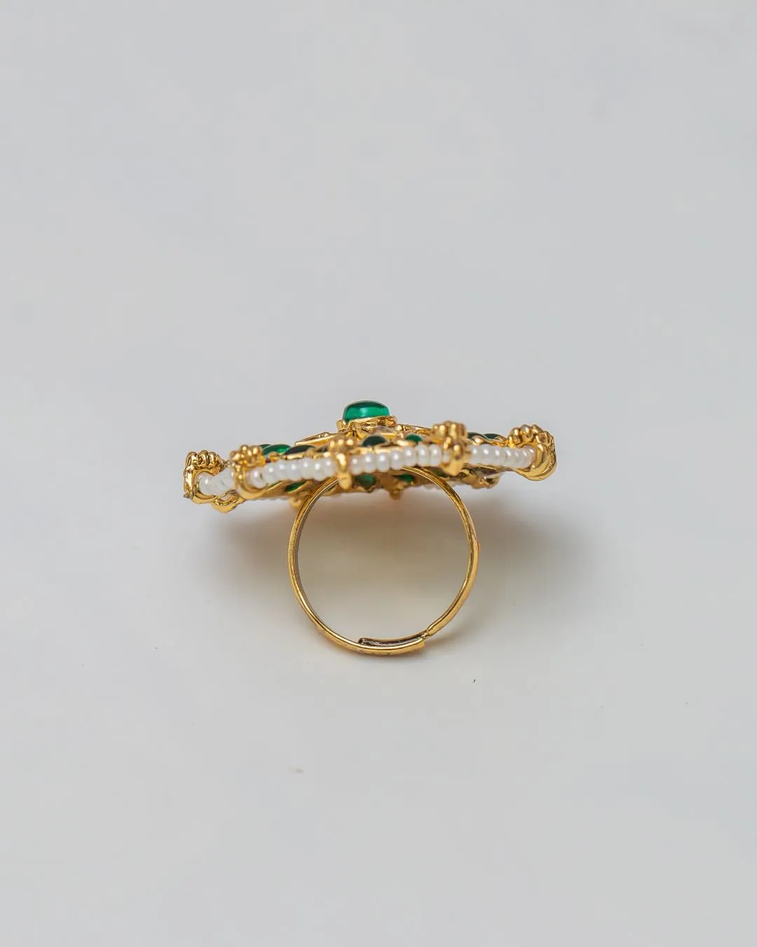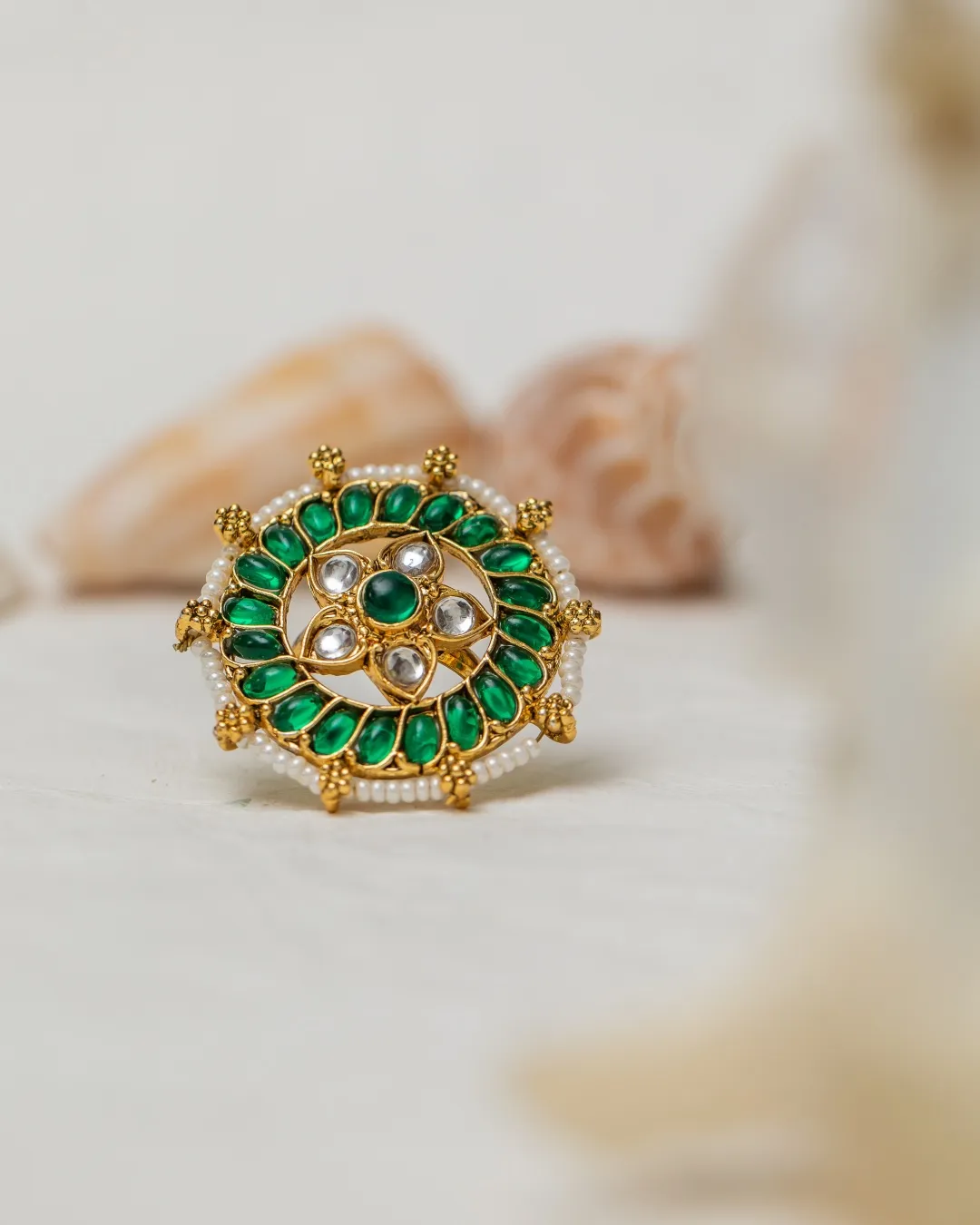 The intricate detailing doesn’t stop there – tiny pearls gracefully outline the contours of the ring, adding a layer of delicacy and refinement. The combination of kemp stones and pearls creates a visual symphony that captures the essence of traditional Indian craftsmanship, making the Karishma Ring a true work of art.